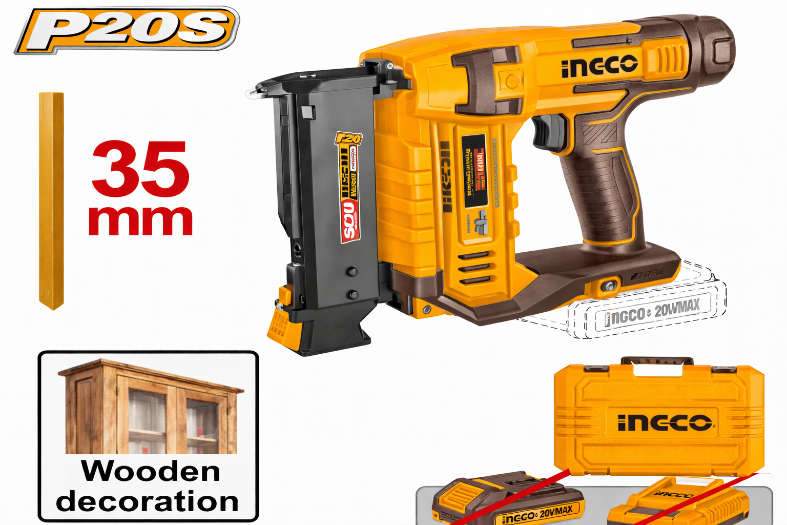 Compact, maniable et pratique, ce cloueur permet de réaliser des fixations propres et efficaces tout en assurant un bon confort d’utilisation. Compatible avec la plateforme INGCO P20S 20V, il s’intègre facilement à votre gamme d’outillage sans fil.