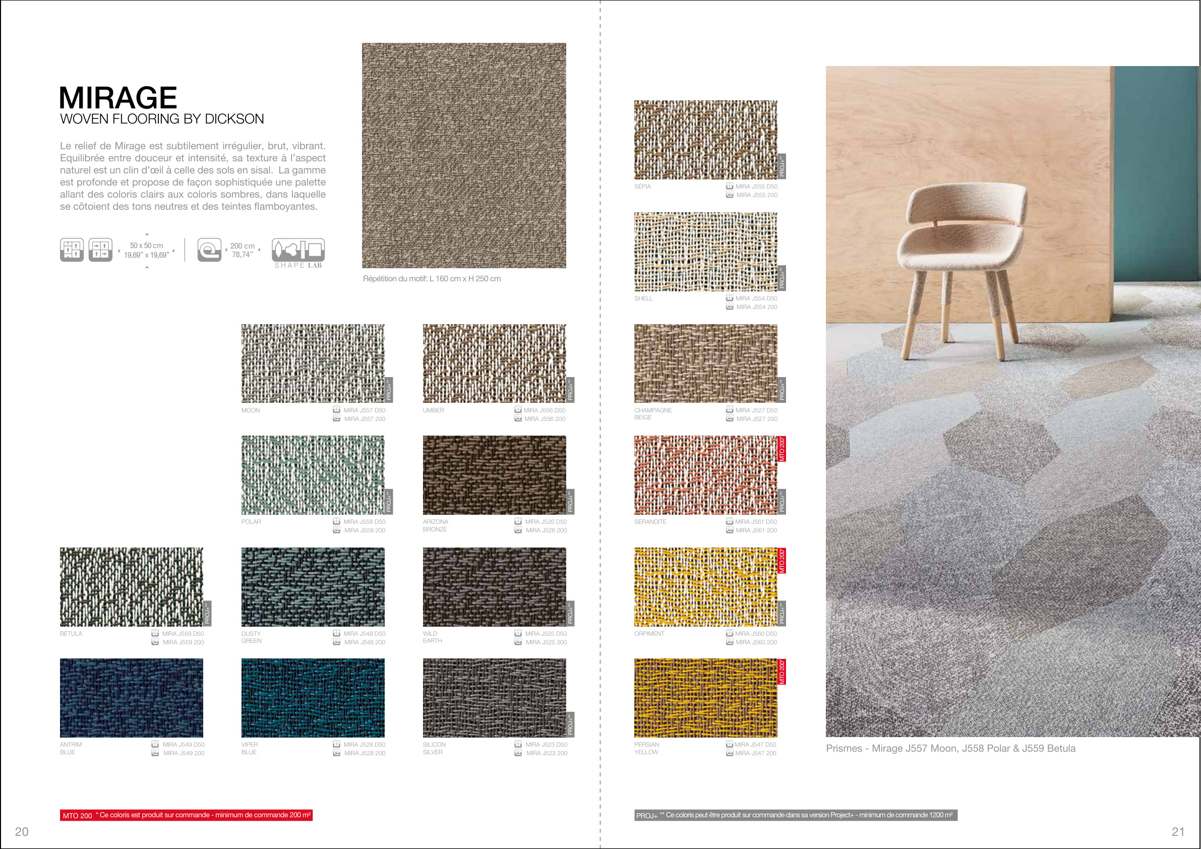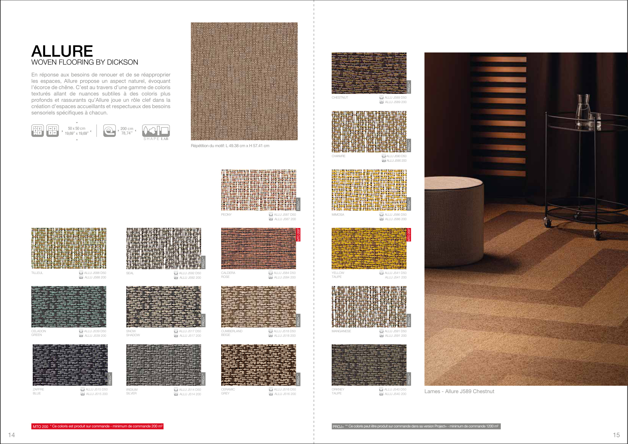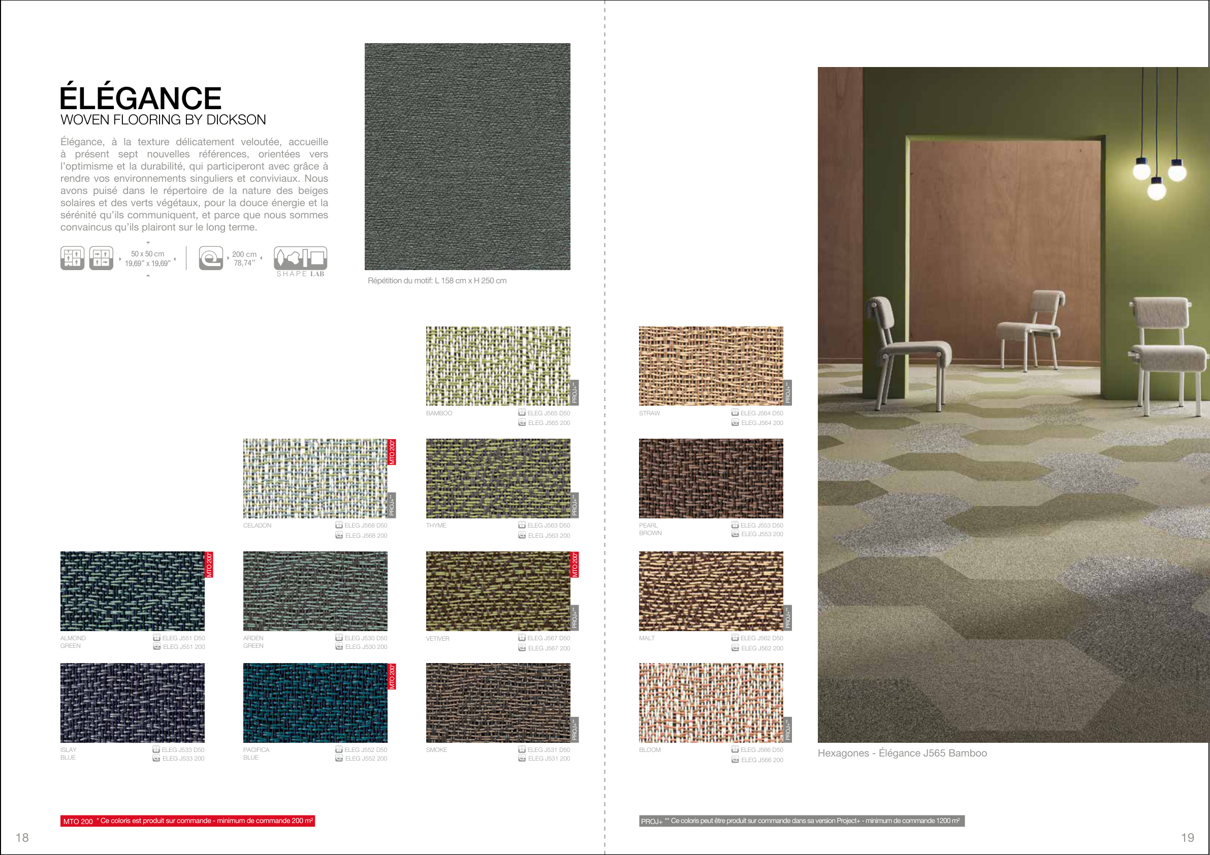 Certaines références sont produites à la demande pour un minimum de 200 m2 ( cf. Made to Order: J541 / J543 / J544 / J547 / J551 / J552 / J560/ J561 / J567 / J568 / J580 /
