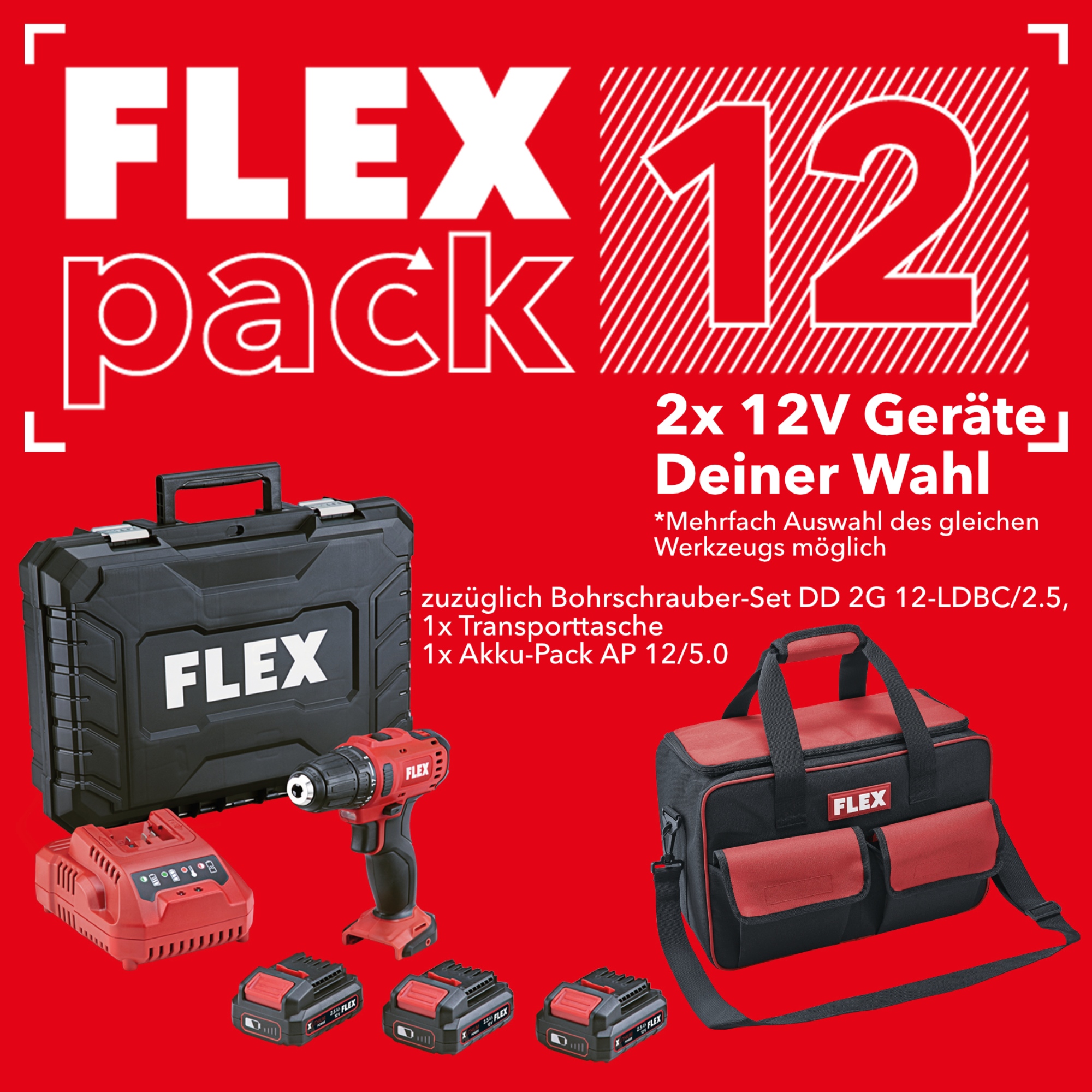 Le FLEXPACK12 vous permet de composer votre équipement. Vous choisissez 2 appareils 12 V dans la gamme, et le pack inclut automatiquement une perceuse-visseuse DD 2G 12, trois batteries, un chargeur et un sac. C’est la solution idéale pour profiter du système 12V Li-Ion Power System.