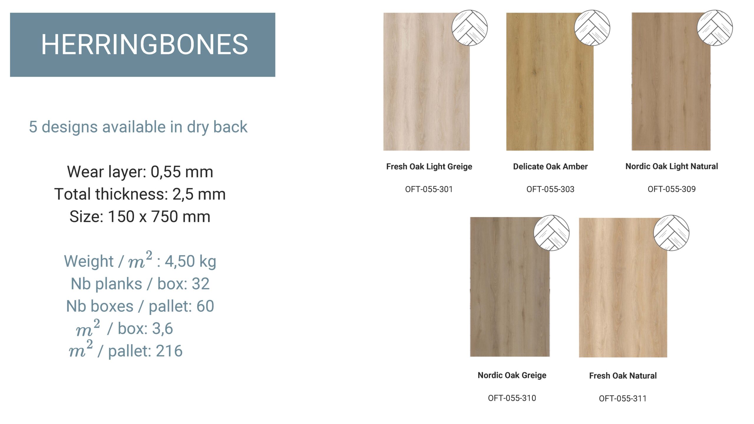 Dalles 457,2 × 914,4 mm – 6 dalles/boîte (2,51 m²), Lames 177,8 × 1219,2 mm – 12 lames/boîte (2,60 m²), Lames 228,6 × 1524 mm – 8 lames/boîte (2,79 m²)