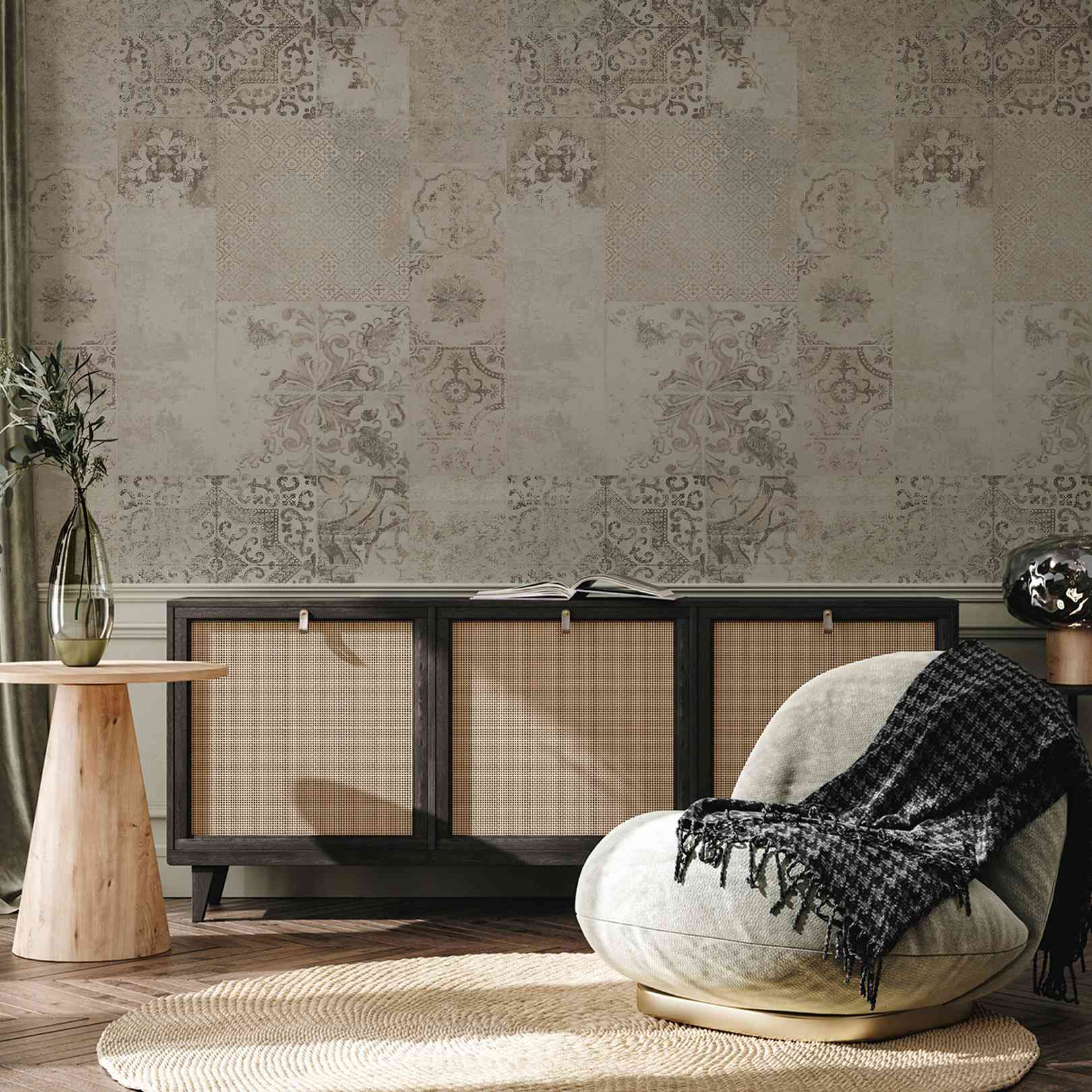• Reliefs et textures 3D : Des arches sculptées façon enduit sablé ou des vestiges de faïences aux accents sépia et vintage.